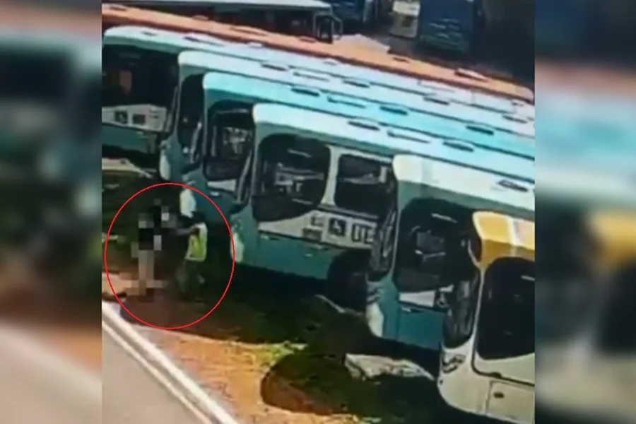 Imagens de uma câmera de segurança (veja acima), divulgadas pelos perfis @santazapzap e @coisasdogama no Instagram mostram o momento em que o suspeito se esconde entre os ônibus, enquanto aguarda a mulher passar.