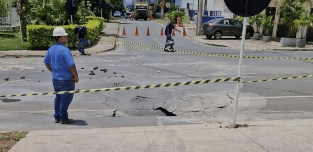 Uma cratera se abriu na manhã desta segunda-feira (2/3) na Rua das Carnaúbas, em Águas Claras (DF), após o rompimento de uma linha de recalque de esgoto. O problema levou à interdição da pista que dá acesso à terceira saída da região administrativa.