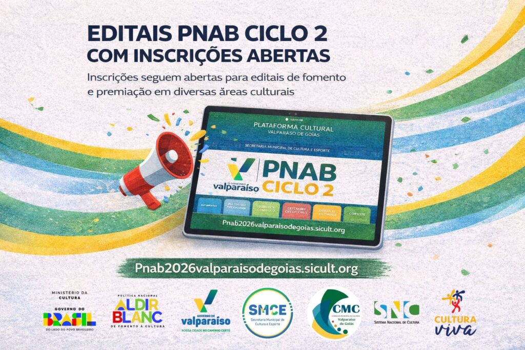 A Prefeitura de Valparaíso de Goiás, por meio da Secretaria Municipal de Cultura e Esporte, publicou os editais da Política Nacional Aldir Blanc de Fomento à Cultura (PNAB – Ciclo 2), iniciativa realizada com recursos do Governo Federal repassados ao município. A ação contempla premiações e seleção de projetos voltados ao fortalecimento das políticas culturais locais.